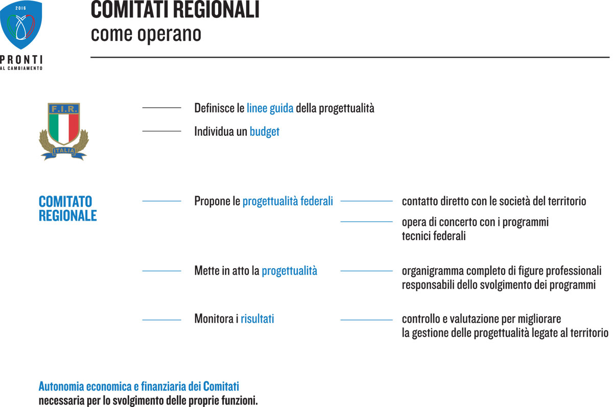 Pur mantenendo un rapporto diretto con la Federazione, i Comitati Regionali avranno una ampia autonomia, sia nell’attuazione dei progetti, sia nella gestione del budget. Soltanto a queste condizioni i Comitati potranno adempiere alla loro funzione primaria ovvero “essere al servizio delle società”. Il principio su cui si regge l’operato dei Comitati Regionali è che ci sia un contatto quotidiano con le realtà locali, fatto di interventi svolti principalmente presso i club. Il vantaggio di questo sistema è duplice, in quanto agevola i club limitandone gli spostamenti e nel contempo consente di monitorare e valutare le problematiche in maniera più diretta.