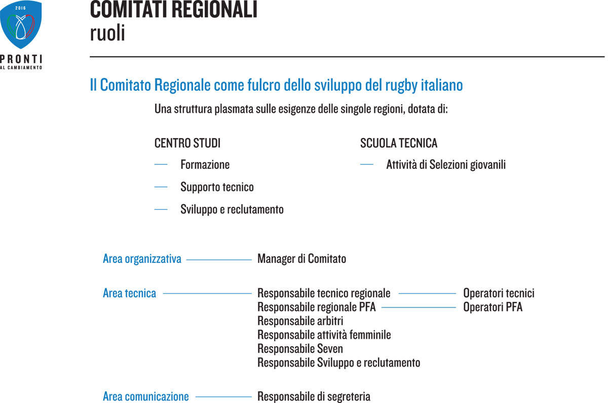 Il Consiglio del Comitato Regionale sarà in questo modo alleggerito dei compiti più legati alla mera messa in atto delle disposizioni regolamentari federali e all’organizzazione dell’attività, potendo in questo modo far fede alla propria vocazione e funzione più naturale e appropriata e cioè gestire la governance della Regione, ramificando i contatti e i collegamenti nei confronti dei Club.