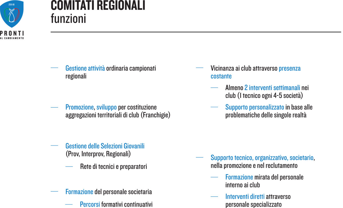 Oltre alla gestione dell’attività ordinaria relativa ai campionati regionali, la sfera di intervento dei Comitati si articolerà nei seguenti ambiti: