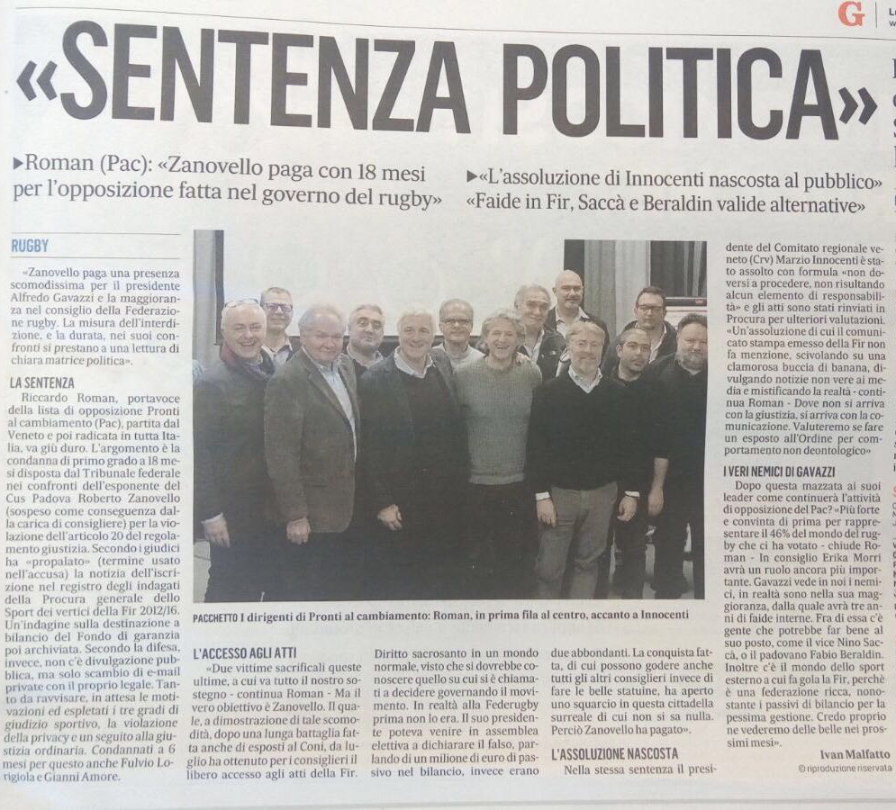 Intervista al Portavoce di Pronti al Cambiamento Riccardo Roman, a seguito della sentenza del Tribunale Federale nei confronti di Roberto Zanovello, Gianni Amore, Fulvio Lorigiola e Marzio Innocenti