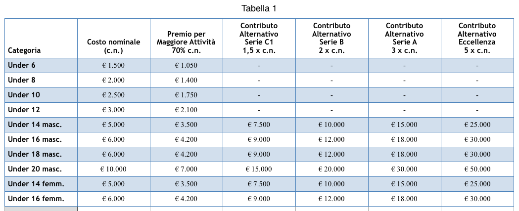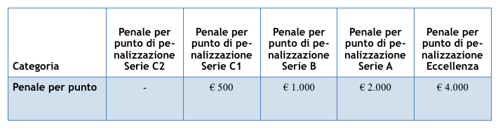 Sarà inoltre possibile vedere scontati i punti di penalizzazione attraverso il pagamento di una penale, secondo parametri individuati e definiti dal Consiglio Federale. Nel caso in cui una squadra intenderà vedersi scontata i punti di penalizzazione assegnati per il mancato svolgimento dell’attività giovanile obbligatoria nella stagione precedente, il Consiglio Federale provvederà a rivedere periodicamente i parametri sottostanti, comunque indicativi: