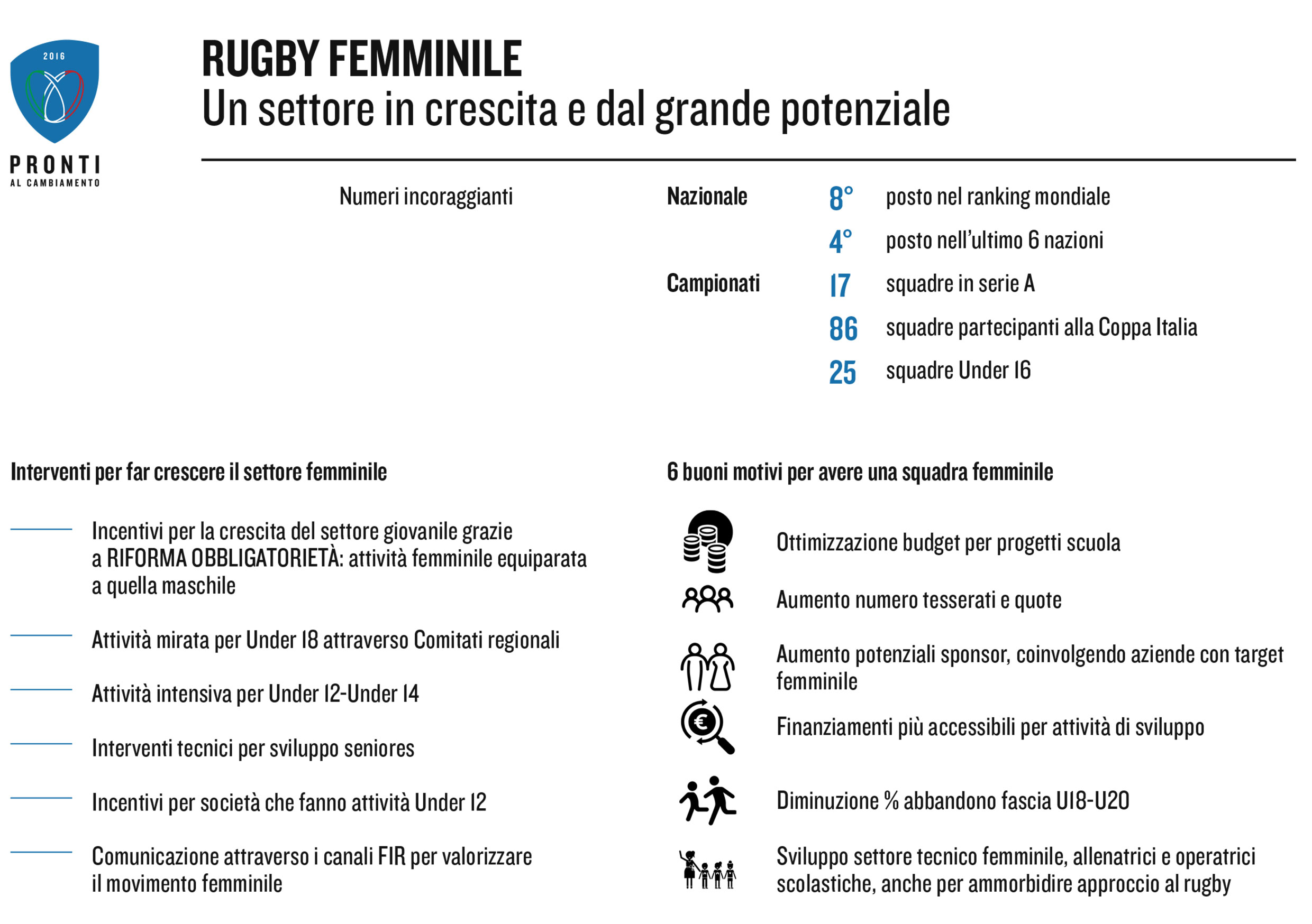 Il rugby femminile potrà essere una solida spalla e un “traino” social-economico per le società che decideranno di strutturarsi con una o più squadre femminili, con molteplici vantaggi per i club stessi: